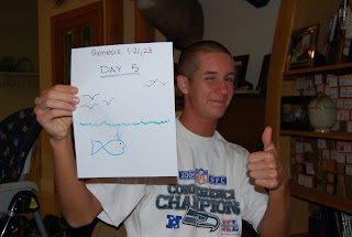 Lance and Kelly were in charge of the lesson where we talked about the creation. We first divided into groups of 2 or 3, after which we were handed a blank piece of paper that had a scripture from the book of Genesis. We were to look the scripture up and decide which day of the creation our scripture talked about and what was created. We then used pens and crayons to draw something that depicted that day. The highlight was when we took turns going around sharing our drawing. So here is the summary of what we learned.